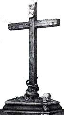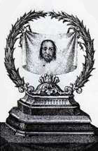 Rij 2: de doornenkroon en purperen mantel die Jezus tot spot te dragen kreeg - de doek van Veronica, met daarop de Volto Santo (het Heilige Gelaat) - de trap met de instrumenten waarmee Jezus gekruisigd werd